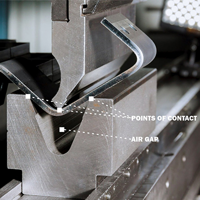 At CraftCutCreate, we form sheet metal and plastic using air bending. During this process, there are only three points of contact between the material and the tooling: the punch and the two sides of the die. An air gap in the die’s trough under the flange's apex gives this process its name