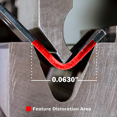 For example, a part cut from 0.104” mild steel will be bent with a 0.630” die. Therefore, any cut feature that is 0.315” or less from the bend line (center of the bend) will be distorted during the forming process