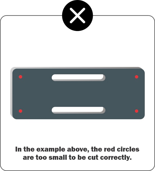 For example, if your material is 0.100” thick, the smallest hole you can cut would be 0.050” in diameter. As a rule of thumb, ensure all geometry is greater than half the material's thickness and no smaller than 0.015”
