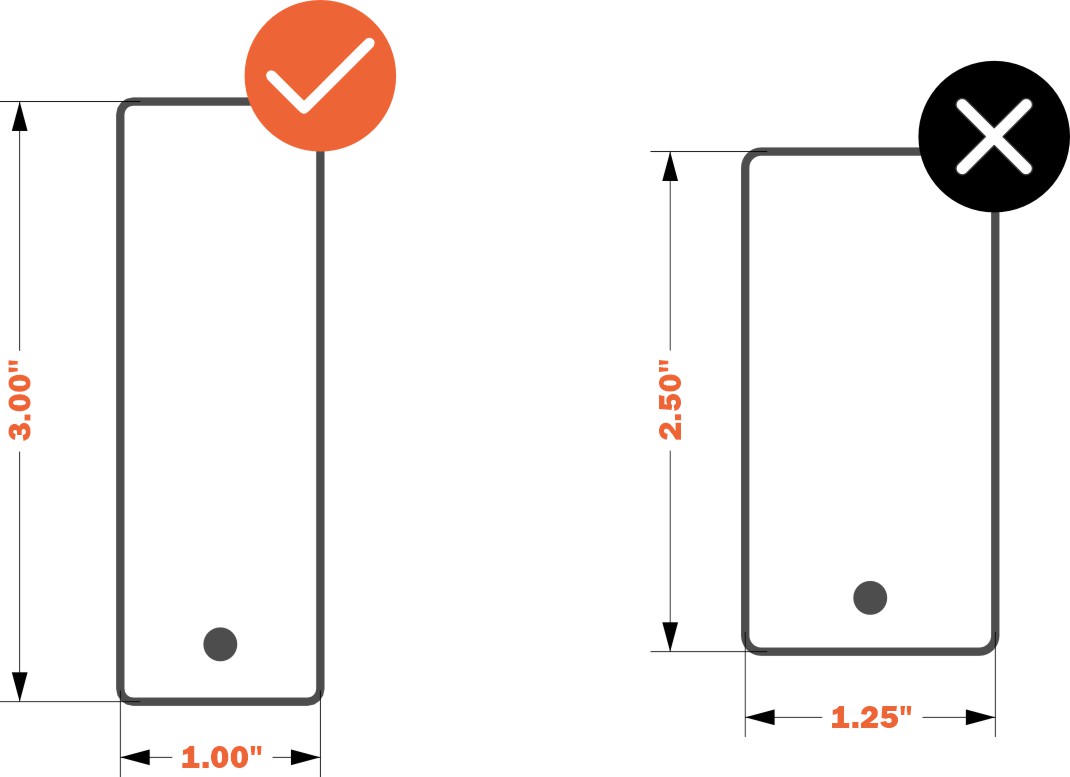 All powder-coated parts must be at least 1″ x 3″. The shortest dimension should be no smaller than 1″, and the total area of the part should be no less than 3 square inches